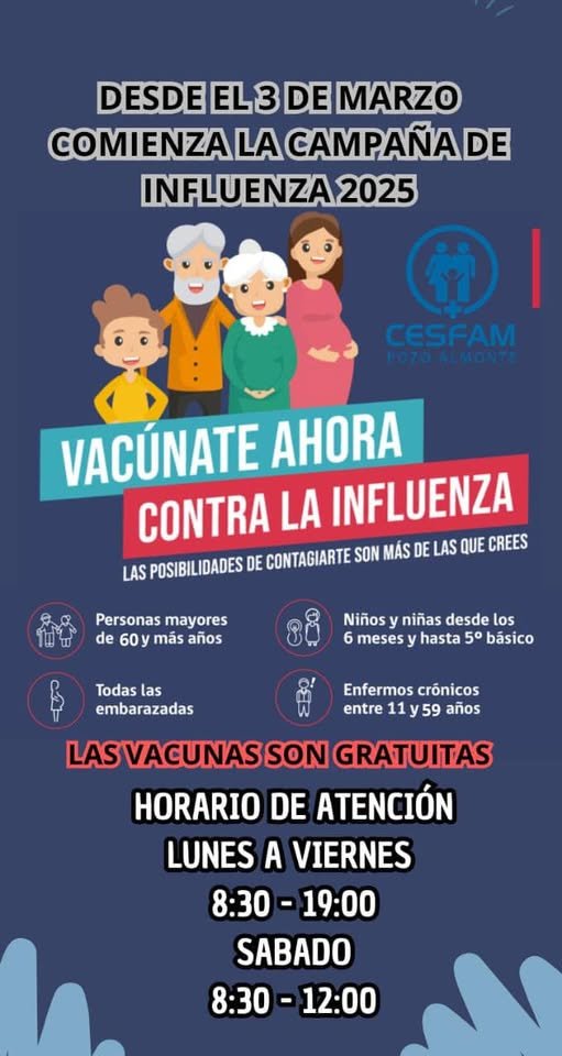 Informamos que desde el lunes 03 de marzo se puede acercar a vacunatorio a vacunarse contra la influenza 2025 todas las personas que se encuentran en los grupos de riesgos.