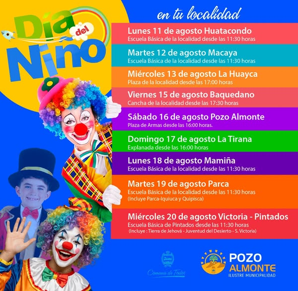 Desde hoy comienzan las celebraciones del Día del Niño en todas las localidades de nuestra comuna, porque donde hay un niño allá tenemos que llegar con todo el equipo municipal . ¡A disfrutar la magia de ser niños, los esperamos! Navegación de entradas Feliz Día del Niño y la Niña .En Huatacondo se vive el Día del Niño .
