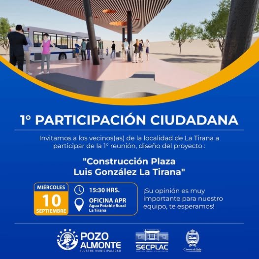 Invitamos a todos los vecinos de La Tirana a la 1era participación ciudadana sobre el proyecto “Construcción Plaza Luis González” 🙌🏼.
