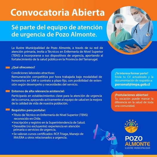 La Ilustre Municipalidad de Pozo Almonte, a través de su red de atención primaria, invita a Técnicos en Enfermería de Nivel Superior (TENS) a incorporarse a sus dispositivos de urgencia, aportando al fortalecimiento de la salud pública en la Provincia del Tamarugal.