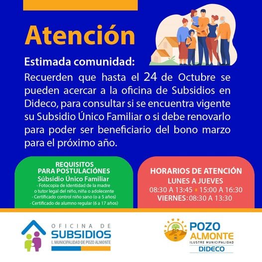 Informamos que hasta el viernes 24 de octubre podrán acercarse a la Oficina de Subsidios en la Dirección de Desarollo Comunitario a consultar por el estado de sus subsidios 😁.