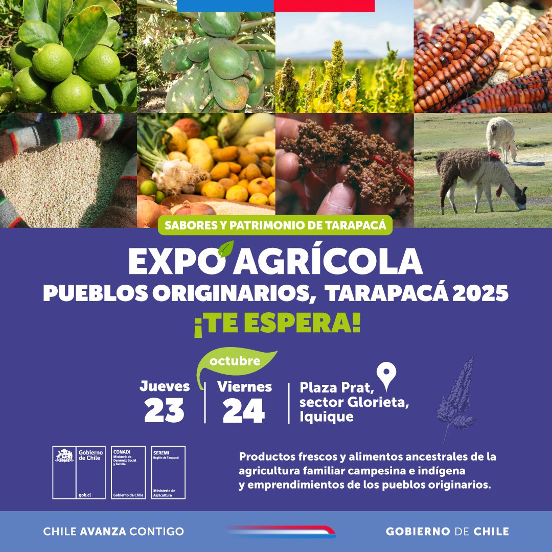 Agricultoras y agricultores de las cinco comunas Tamarugal, proveedores locales del rubro silvoagropecuario, servicios públicos dependientes del Ministerio de Agricultura y expositores del área tendrán cita en Iquique este jueves 23 y viernes 24 de octubre desde las 10 a las 19 horas en Plaza Prat sector Glorieta con la Expo Agrícola Pueblos Originarios Tarapacá 2025 organizada por la Corporación Nacional de Desarrollo Indígena y la Secretaría Regional Ministerial de Agricultura de Tarapacá.