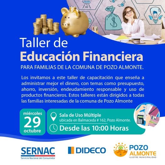 La Municipalidad de Pozo Almonte invita a todas las familias de la comuna a participar en un taller gratuito de educación financiera, donde podrás conocer herramientas prácticas para organizar tu presupuesto, mejorar tus hábitos de ahorro y fortalecer la economía familiar.