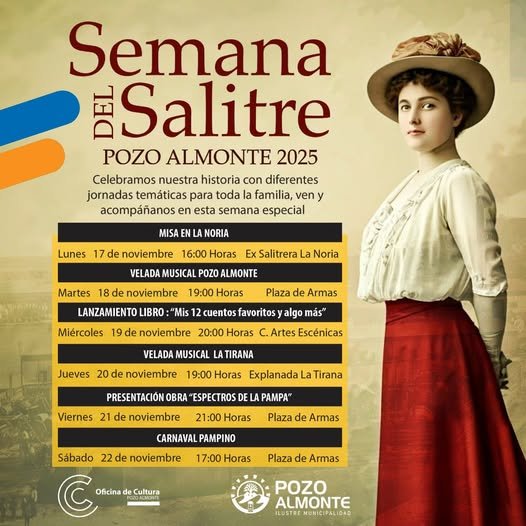 Desde el 17 al 22 de noviembre se conmemora la Semana del Salitre 2025 en Pozo Almonte, celebrando la historia con diferentes jornadas temáticas para toda la familia. ¡Acompáñanos en esta gran semana! ![]()