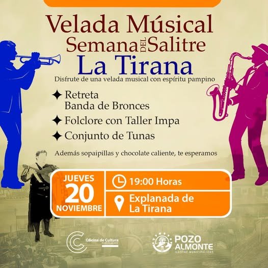 Seguimos con las actividades de la semana del Salitre 2025: Se invita a toda la comunidad a disfrutar de una tarde llena de música y tradiciones pampinas