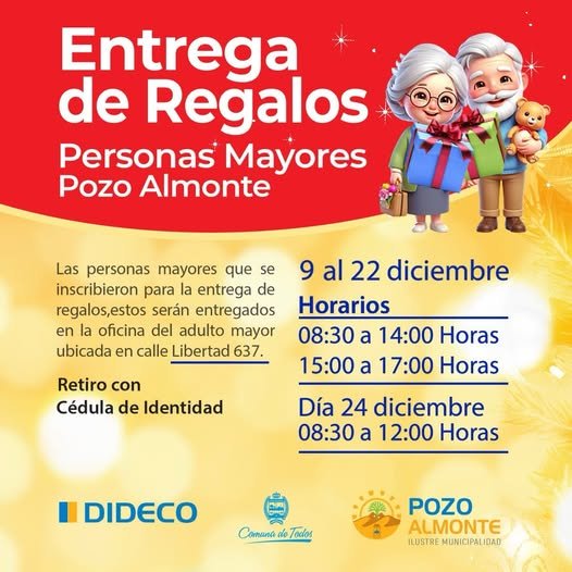 Desde el 9 al 22 de diciembre se estarán entregando los regalitos para todos quienes se inscribieron previamente en la Oficina del Adulto Mayor, ubicada en Calle Libertad 637.