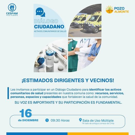 Invitamos a toda la comunidad a participar de un Diálogo Ciudadano, el que tiene por objetivo conversar sobre los recursos, servicios, espacios y capacidades que fortaleces nuestra salud comunal.