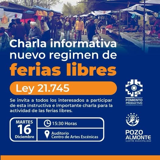 Se invita a feriantes y a la comunidad en general a participar de esta importante charla informativa, donde se abordarán los alcances del nuevo régimen de ferias libres y su impacto en la actividad.