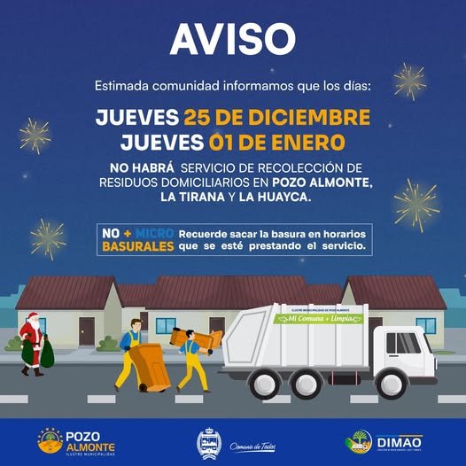 NO HABRÁ RECOLECCIÓN DE RESIDUOS DOMICILIARIOS EL 25 DE DICIEMBRE Y 01 DE ENERO. En nuestra de Pozo Almonte, La Tirana y La Huayca