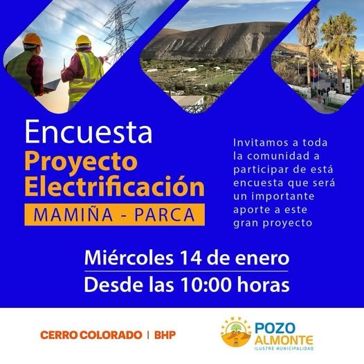 Invitamos a vecinas y vecinos de Mamiña y Parca a participar de esta importante encuesta comunitaria, que será un aporte fundamental para el desarrollo del proyecto de electrificación del sector.