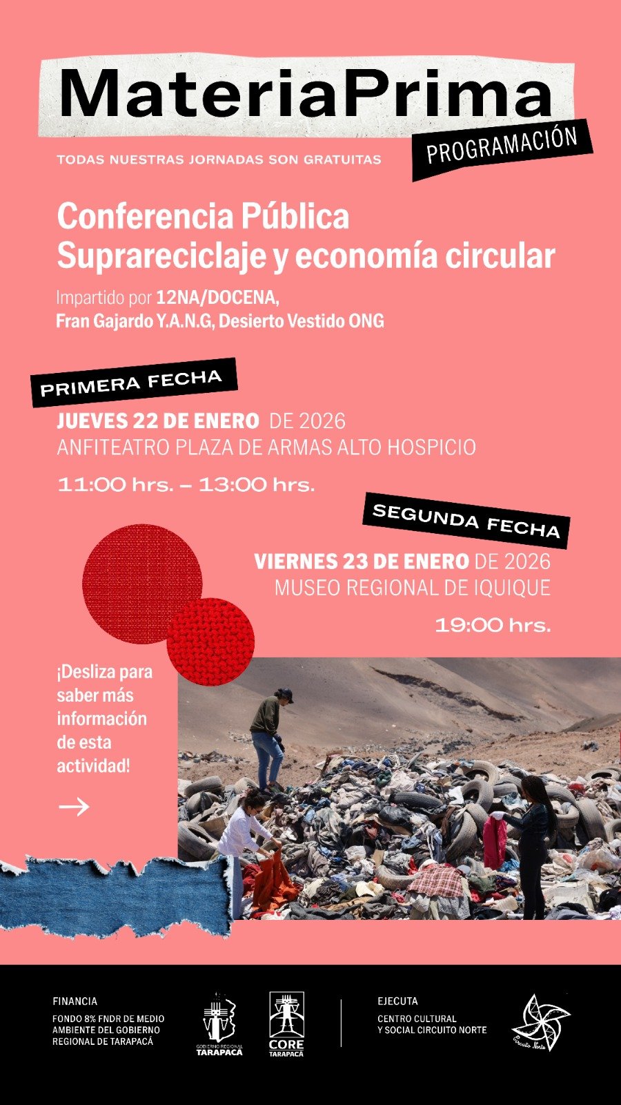 Desde este jueves 22 de enero, el proyecto MATERIAPRIMA desarrollará conferencias y talleres abiertos a la comunidad en Alto Hospicio e Iquique, abordando la crisis de los vertederos textiles en el desierto y su impacto en las ciudades. Referentes internacionales en economía circular y suprareciclaje llegan a la región para liderar un programa gratuito de educación ambiental.