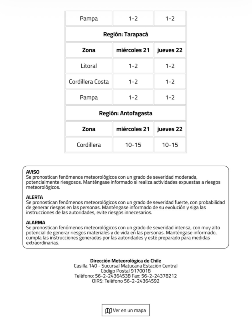 La Dirección Meteorológica de Chile emitió un Aviso Meteorológico actualizado por precipitaciones normales a moderadas que afectarán a la Región de Tarapacá, asociadas a la condición sinóptica Alta de Bolivia.