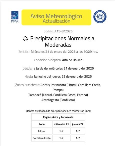 La Dirección Meteorológica de Chile emitió un Aviso Meteorológico actualizado por precipitaciones normales a moderadas que afectarán a la Región de Tarapacá, asociadas a la condición sinóptica Alta de Bolivia.