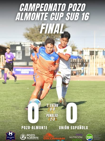 Orgullo total para nuestra comuna. La selección Sub 16 de Pozo Almonte cerró una participación histórica en la Pozo Almonte Cup 2026, quedándose con el segundo lugar del torneo, tras una emocionante final definida en penales frente a Unión Española, luego de un intenso empate sin goles en el tiempo reglamentario.