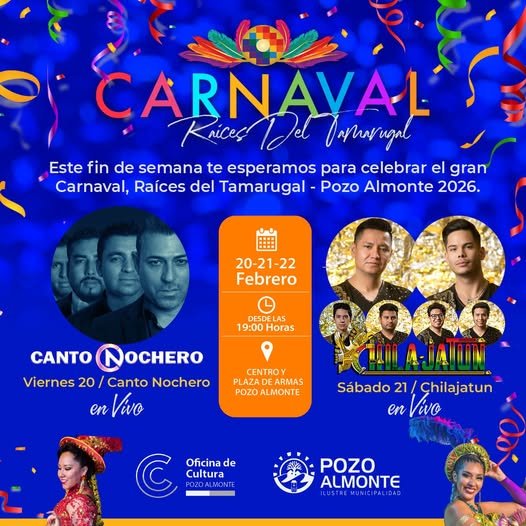 Este fin de semana, la alegría, la música y nuestras tradiciones se toman la comuna con el gran Carnaval Raíces del Tamarugal en Pozo Almonte .