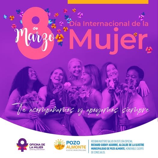 En este Día Internacional de la Mujer, la Ilustre Municipalidad de Pozo Almonte, a través su alcalde Richard Godoy Aguirre y el Honorable Concejo Municipal, extienden un afectuoso y sincero saludo a todas las mujeres de nuestra comuna y sus localidades