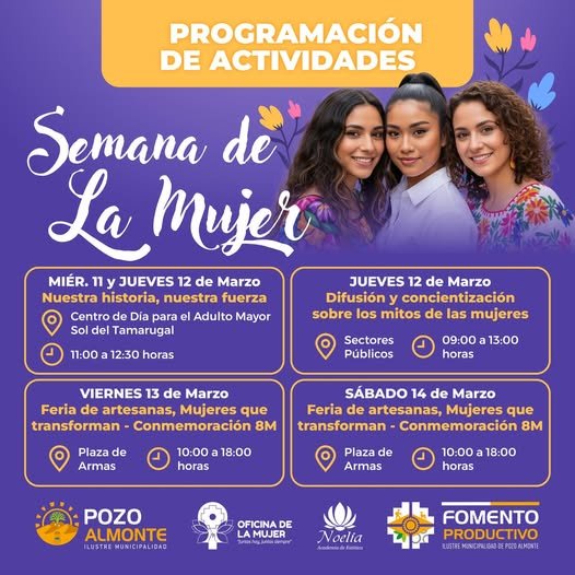 En el marco de la conmemoración del Día Internacional de la Mujer (8M), la Oficina comunal de la mujer de Pozo Almonte realizará diversas actividades orientadas a relevar la historia, el aporte y la fuerza de las mujeres en nuestra comuna.