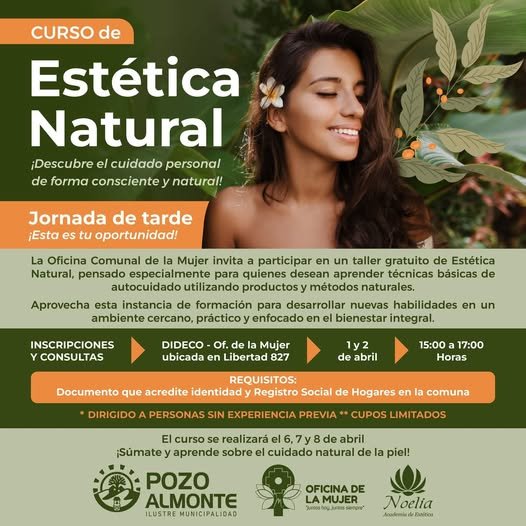La Oficina Comunal de la Mujer invita a participar en un taller gratuito de Estética Natural, pensado especialmente para quienes desean aprender técnicas básicas de autocuidado utilizando productos y métodos naturales.