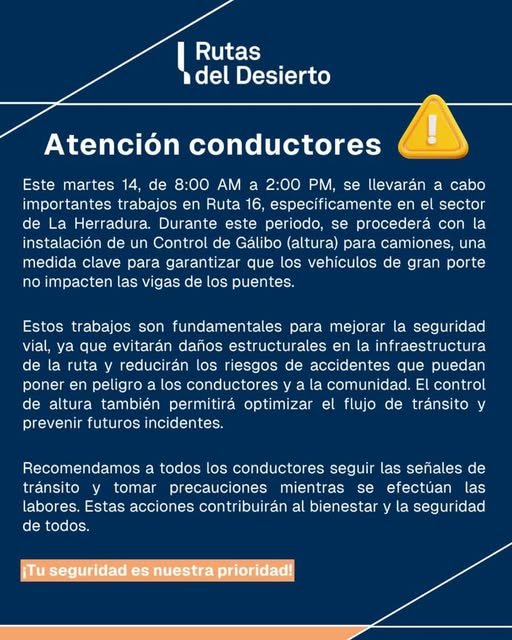 Este martes 14, de 8:00 AM a 2:00 PM, se llevarán a cabo importantes trabajos en Ruta 16, específicamente en el sector de La Herradura. Durante este periodo, se procederá con la instalación de un Control de Gálibo (altura) para camiones, una medida clave para garantizar que los vehículos de gran porte no impacten las vigas de los puentes.